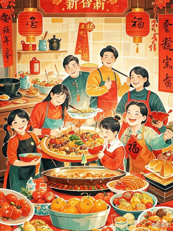 • 吃年夜饭:全家团聚,共进丰盛的晚餐,桌上一般有鸡(寓意有吉)、鱼(寓意有余)等以求吉利。