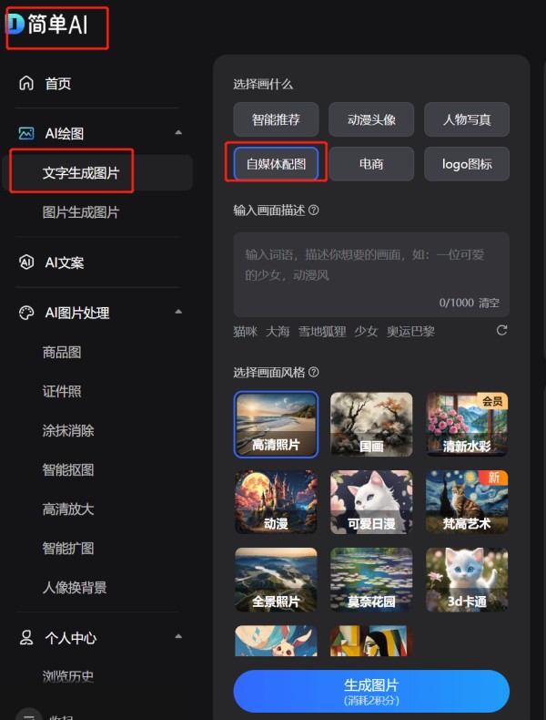 我们选择“AI绘图”中的“文字生成图片-自媒体配图”,然后在【选择画面风格】模块,选择你喜欢的模板。风格模板:高清照片、国画、清新水彩、动漫、可爱日漫、梵高艺术、全景照片、莫奈花园、3D卡通……