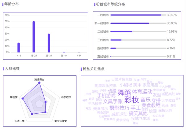 分析#chiikawa话题下的受众画像,年龄在18-24岁的年轻用户占比超过50%,涵盖等一线、新一线城市的流行男女、学生党、彩妆党等,主要关注彩妆、舞蹈、音乐、手工、手账、动漫等内容,涉及多个兴趣圈层