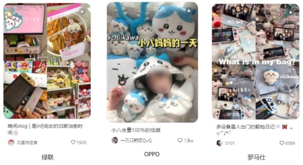 商业笔记品牌投放数TOP10中,数码品牌占比50%,罗马仕、绿联、OPPO、倍思、金运等品牌已率先入局,投放动漫、手账、潮玩博主,封面与内容“含chiikawa量”极高,画风陪伴感十足,爆文频出。