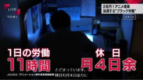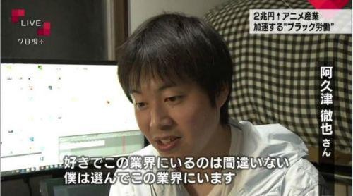 接着,节目用具体的从业人员来举例说明业界的艰苦。令人不敢相信的是,动画师每画一张合格的中间帧只有200日元(大约12人民币)的收入,而一天最多只能画20张。由于动画的要求越来越精细,现在画一张的所耗费的精力比以前还要久,但是单价并没有上涨,动画师常常要面临付出比收获更多的劳动。另一个新人动画师阿久津彻更是惨得不行,住在NPO机构提供的廉价房里,收入低(年收约6.2万人民币),吃得差,活动空间小,睡觉的时候还要拉开工作的地方席地而睡,炒饭洒了一点就觉得很浪费。他还透露干他这行的只有2成上位动画师能够结婚,他之所以进入就是因为喜欢动画而已,看来业界还没崩盘完全是靠爱发电。