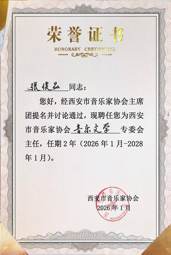 近日,经西安市音乐家协会主席团提名并讨论通过,张峻品同志正式受聘为西安市音乐家协会音乐文学专委会主任,任期为2026年1月至2028年1月。