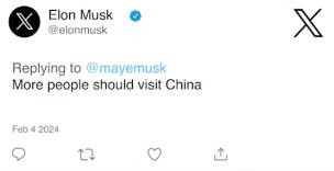 这条贴文还引来了儿子埃隆·马斯克的互动,他回复道:“更多人应该去中国看看。”