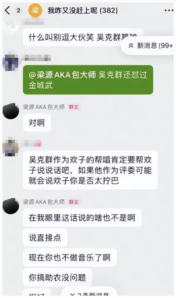 梁源粉丝群的聊天截图一曝光 全网炸锅。群里有人diss吴克群“不务正业跑去助农” 梁源不但没拦 还甩出“TM锤的就是你这种”“low爆”等脏话,甚至把吴克群帮农民卖3万斤菜的公益行动当成攻击点,质问“搞助农也配谈音乐?”这和梁源平时标榜的“专业音乐普及者”形象 反差拉满。