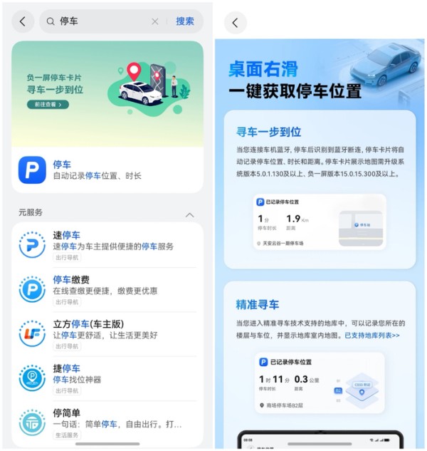 现在,华为负一屏把这一切都“打包”成了一个指尖上的“出行管家”。只需轻轻右滑手机屏幕,进入负一屏,上滑探索元服务,春运所需的全部信息便一目了然:铁路12306卡片实时同步车次动态、座位信息,发车前还会贴心提醒具体的检票口及检票时间提醒,闸机扫码乘车便能快速进站,不用再一边拖着行李箱一边搜索App查信息狼狈前行。以此类推,航旅纵横、同程旅行等订票出行服务也均可在负一屏上便捷操作,行程变更及时更新推送,不用担心错过重要通知;如果你选择自驾回家,可以直接搜索停车元服务添加“停车向导”:它能自动记录停车位置、时长,甚至识别地库楼层并展示3D地图,寻车再也不用绕着停车场转圈圈。更棒的是,目的地天气、推荐酒店等信息直接呈现在眼前,落地后还会为你规划最佳路线和附近美食,从出发到抵达,每一步都省心又高效。