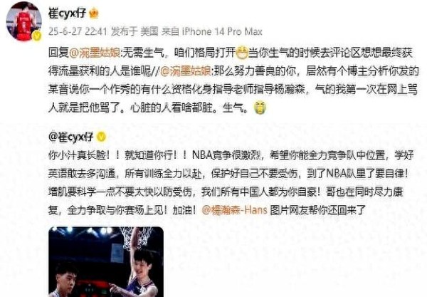 杨瀚森能在首轮被选中,确实是中国篮球的一个里程碑。作为同样在NBA打拼过的中国球员,崔永熙给出祝福和建议,这本身就是很自然的事情。