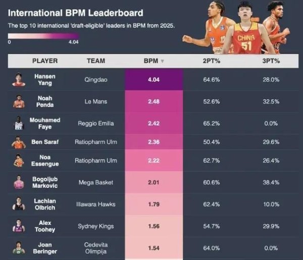 炸裂!2025NBA选秀海外赛场,中国新星杨瀚森BPM力压群雄登顶