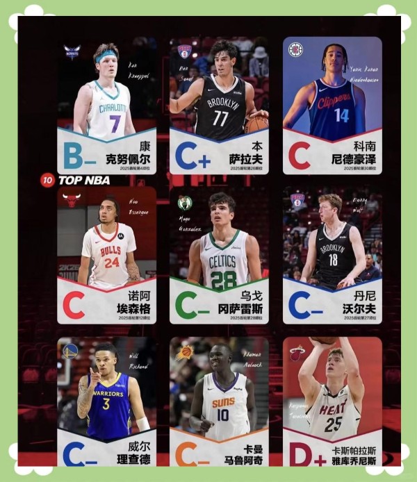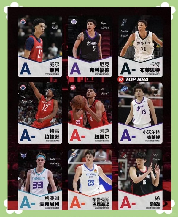 杨瀚森与考沃德的高顺位选择也引起众多讨论和质疑。杨瀚森在选秀夜以黑马姿态脱颖而出,成为开拓者从第11顺位交易至第16顺位的猎物,这一举动震惊了整个联盟。这位20岁的中锋,原本被普遍预测为次轮初段的人选,却因开拓者管理层的持续考察和重点培养,最终在夏季联赛中以场均10.8分、5个篮板、3.8次助攻的出色表现,展现出了卓越的策应天赋。然而,移动速度和防守潜力的问题依然存在,一位东部高管坦言:“我欣赏他的才华,但没想到他会落选至乐透区边缘。”