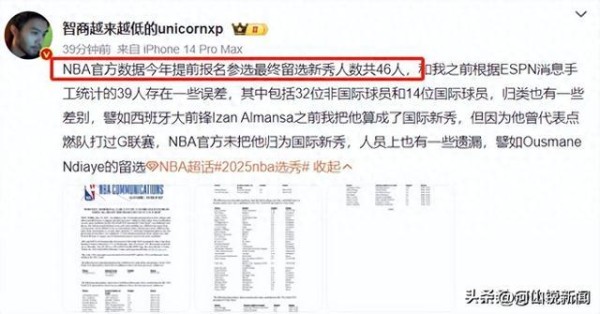 北京时间 6 月 18 日,NBA 选秀专家王健带来一则重磅消息:NBA 官方公布了 2025 年选秀大会的参选人数,留选新秀共计 46 人。这 46 位篮球新星,犹如 46 颗即将升起的璀璨新星,即将在选秀大会的舞台上一决高下。选秀大会定于 6 月 26 日和 27 日盛大举行,第一天的首轮选秀无疑是关注度最高的环节,各支球队都渴望在首轮挑选到能够改变球队命运的基石球员;次日的第二轮选秀同样不容小觑,许多 “遗珠” 往往能在这里被慧眼识珠的球队发掘,从而在 NBA 赛场上大放异彩。