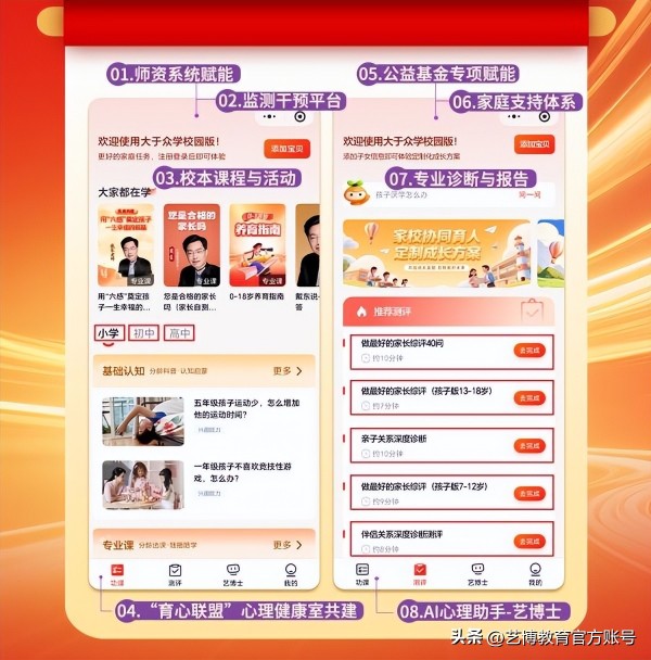 “大于众学-校园版”平台的正式上线,正是艺博教育深刻领会政策精神,立足十八年家庭教育实践积淀,主动响应社会需求,深化家校社协同育人模式的有力举措,将政策要求转化为可落地、可感知的具体服务,为青少年健康成长筑牢温暖防线。