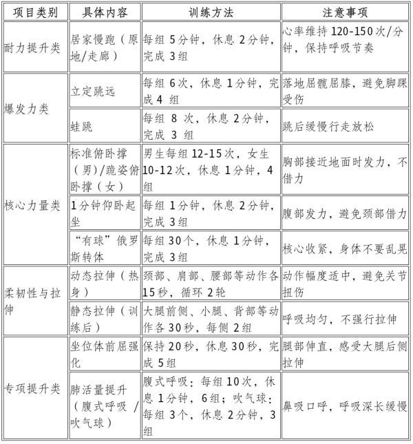 中学段:(初中、高中、中职):聚焦“专项化+提升性”,推荐引体向上(男生每日必练)、1分钟仰卧起坐(女生每日必练)、标准俯卧撑、立定跳远、蛙跳等项目,针对性弥补体能短板,每天锻炼30-40分钟,在突破自我中提升综合运动能力。