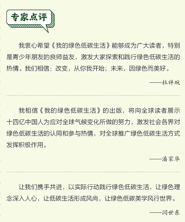 由中国工程院院士、中国工程院原副院长、国家能源咨询专家委员会副主任杜祥琬,中国社科院学部委员、国家气候变化专家委员会副主任潘家华、生态环境部宣教中心主任闫世东作序,20余位院士、专家、学者担任学术顾问,人民日报数字传播研究中心主任、人民碳中和研究院院长宋明霞撰写,陈慧玲绘图、廉子健翻译的《我的绿色低碳生活》一书,前不久由中国电力出版社以中英文双语出版发行。这是一本倡导绿色低碳生活方式,传播绿色低碳生活美学,打造低碳生活行动指南的科普教材。
