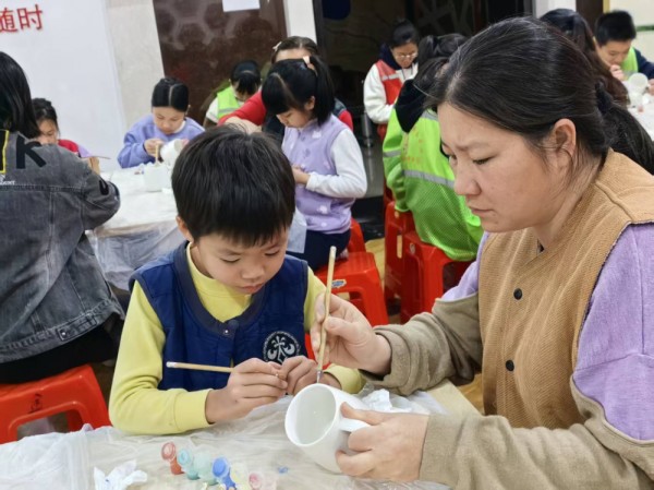 压轴活动“新春添‘彩’纳福·广彩非遗传承”在社区活动室开展。活动特邀承彩轩广彩陶艺文化传承基地林老师亲临指导。林老师师从广彩代表性传承人许珺茹与许恩福,技艺精湛。在她的耐心讲解下,亲子家庭共同绘制马年主题广彩马克杯,于笔触流转间体验非遗魅力,感受匠心精神。一件件独一无二的作品,不仅为新春添彩,更寄托“幸福一辈子”的美好寓意,让传统文化在亲子共学中焕发新生。