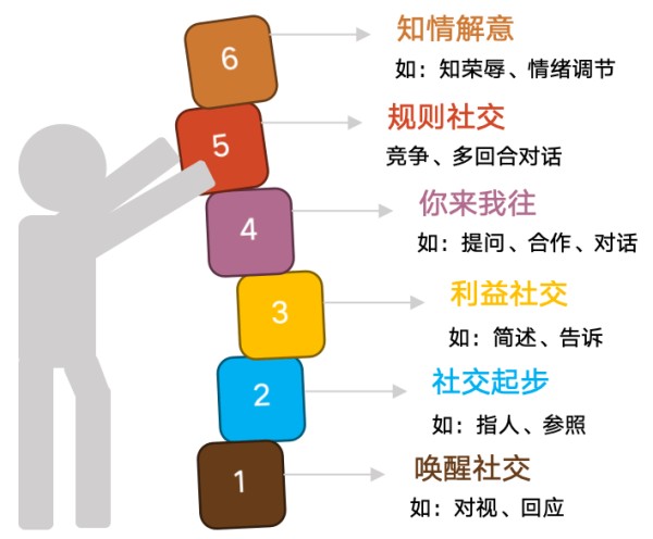 根据孩子社交困难的程度,我们可以把社交发展想象成一座“阶梯”,分为六个阶段。每一阶都对应着关键的社交元素,而我们可以通过设计对应的社交游戏、活动,并运用科学的干预技巧,帮助孩子一步一步向上走。