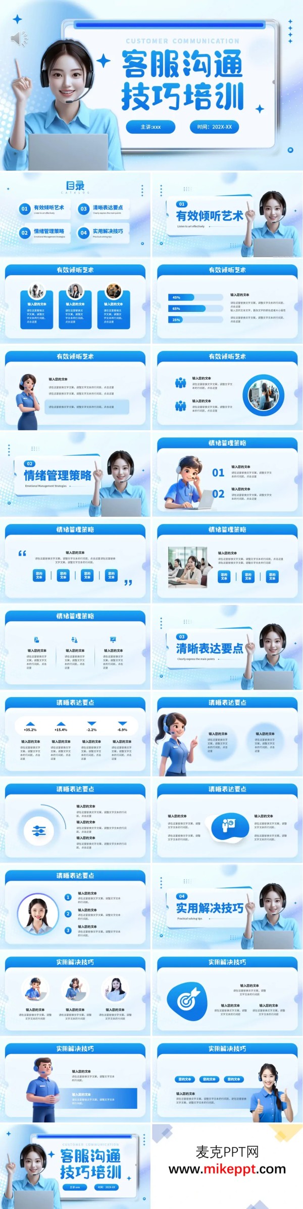 这份《客服沟通技巧培训》PPT围绕客户服务场景中的核心能力展开,内容结构清晰,分为四个主要模块:有效倾听艺术、情绪管理策略、清晰表达要点和实用解决技巧。 在“有效倾听艺术”部分,PPT通过百分比图示强调倾听在沟通中的重要性,指出客服人员需专注理解客户需求,避免主观打断,并通过复述确认提升沟通准确性。紧接着,“情绪管理策略”模块提出应对客户情绪的方法,包括自我调节与换位思考,帮助客服人员保持专业态度,避免情绪冲突。 “清晰表达要点”章节通过正负百分比数据对比,突出语言简洁性与条理性的价值,例如使用结构化话术分点说明,避免歧义。最后,“实用解决技巧”部分结合场景示意图,介绍具体问题处理流程,如快速定位问题根源、提供可操作的解决方案,并配以案例说明如何逐步推进客户满意度。 整体来看,本PPT以理论结合实践的方式,覆盖了客服沟通的关键环节,旨在提升服务效率与客户体验,内容设计兼具指导性与实用性。