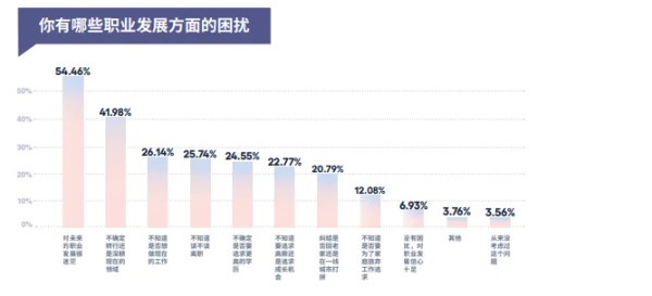 找不到方向,就是我们常说的“迷茫”,根据简单心理《2020大众心理健康洞察报告》,最让职场人困扰的问题是:对未来职业发展的迷茫,占54.46%。
