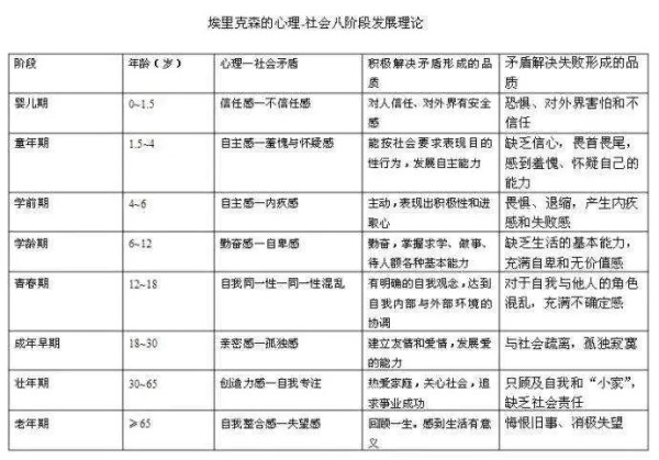 心理学家艾瑞克森将人的自我意识的形成和发展分为八个阶段,在他看来,人在一生中的不同阶段都会遇到一个特定的冲突,如果能够顺利解决,个体的能力就会得到扩展,顺利进入下一阶段;而如果不能,这个问题就会在之后继续干扰他,体现在职业、亲密关系各个方面。