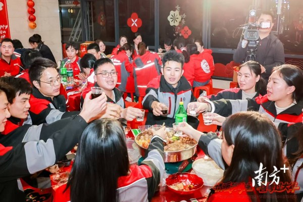 掀开大盆菜,蒸腾的热气裹挟着浓郁的酱香扑鼻而来。十余双筷子齐齐伸向盆中,职工们边吃边聊,汤汁咕嘟作响,交织着欢笑与碰杯声。围炉共食的暖意将人们带回过去三十年的小年夜记忆里——有人讲起第一年来吃盆菜时,还是个小伙子;有人指着盆里的虾说,这像极了当年在西区港口吃的味道。此刻,所有开发区建设者的奋斗与足迹,都化作眼前这一盆实实在在的温暖——一盆人间烟火,便是最隆重的团圆。