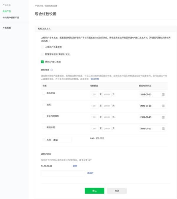 说明:在开通时请如实选择你的使用场景,且在红包的发放过程中如实上报你的场景,如有作假,微信支付将有权根据《微信支付商户平台使用协议》对你的商户号做出处理。
