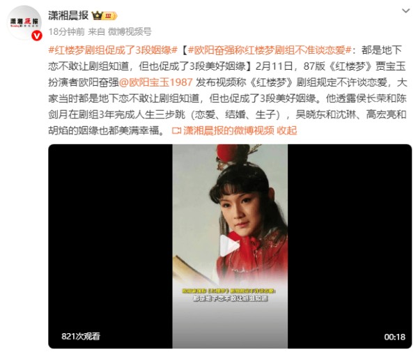 2月11日,87版《红楼梦》中贾宝玉的扮演者欧阳奋强在视频中透露,当年剧组有明确规定,禁止演员谈恋爱,大家只能偷偷发展感情,却也因此成就了三段美满姻缘。他表示,侯长荣与陈剑月在剧组三年便完成了相恋、成婚、生子的人生三部曲,吴晓东与沈琳、高宏亮与胡焰也都收获了幸福长久的婚姻。