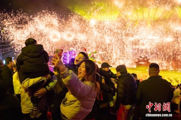 2月14日晚,《千年铁魂》打铁花表演在山西晋城司徒小镇上演,众多游客到此观演,共迎新春。图为观众在演出结束时拍照留念。中新社记者 杨郁然 摄