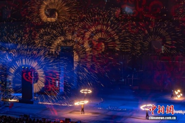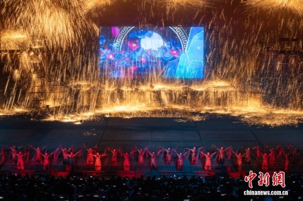 2月14日晚,《千年铁魂》打铁花表演在山西晋城司徒小镇上演,众多游客到此观演,共迎新春。图为演出现场。中新社记者 杨郁然 摄