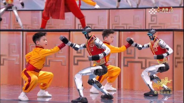 由宇树科技机器人与河南塔沟武术学校的小朋友同台呈现的节目《武BOT》中,机器人在和小朋友对练。(央视频截图)