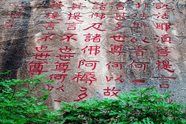 我国现存最为著名的佛经摩崖石刻《泰山经石峪金刚经》,刻于山东省泰安龙泉山谷中的经石峪,内容为节录后秦鸠摩罗什所译的《金刚般若波罗密经》,现残存一千零六十九字。经清阮元《山左金石记》考证,作于北齐天保间(550-559年)。