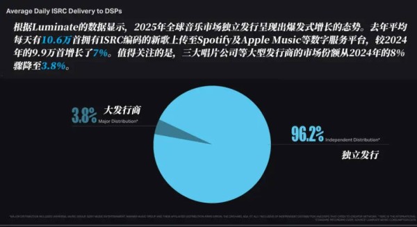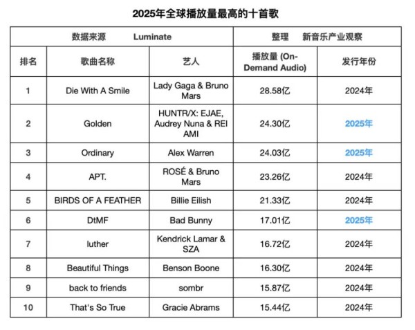 根据数据机构Luminate 的年终报告,2025年,全球音乐流媒体播放量达到了5.1万亿次,比2024年增长近10%,创下历史新高。全球音乐平台上获得ISRC编码的歌曲就多达2.53亿首,比2024年新增超过5000万首。