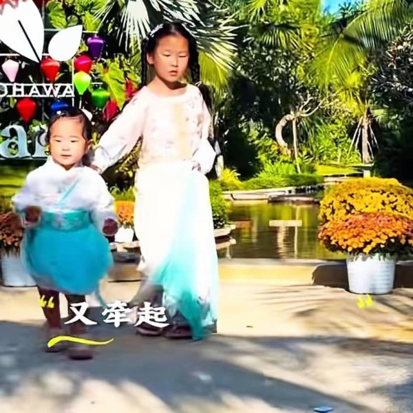 杜星霖还晒出了2个女儿的照片,1岁多的小龙珠和姐姐小花仙穿着同款的民族风长裙,她们应该是在园区里游玩。