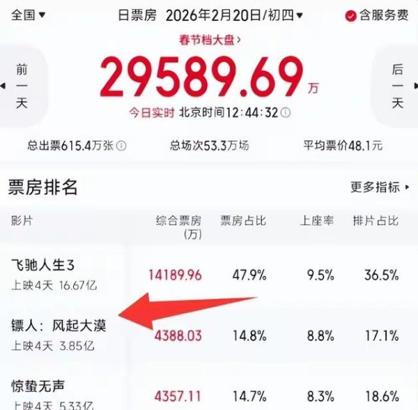 2026年春节档最热闹的舞台上,意外的戏码轮番上演。大年初四,票房榜单悄然变化,一场武侠动作片《镖人》完成了一次惊艳的反超,超过了张艺谋导演的谍战片《惊蛰无声》,从首日第四跃升至单日票房亚军,震惊业内和观众。
