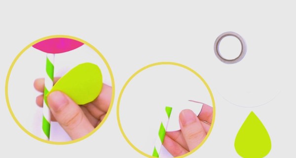 将制作完成的花瓶与精心剪裁的叶子,分别粘贴于吸管的顶部和中部偏上位置。