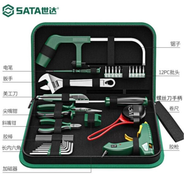 世达35件套05135主要含有钳子、美工刀、卷尺、扳手、螺丝批、迷你钢锯和测电笔,不包含锤子,但有胶棒和胶枪组合,可用于组装、固定物件,适合轻型DIY工作,如制作工艺品。