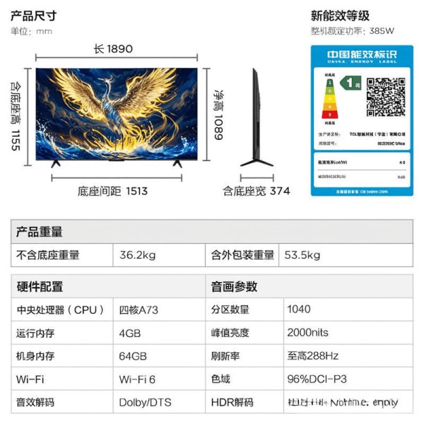 QD-MiniLED & 高色域显示:量子点MiniLED技术带来更纯正的色彩和更高对比度,画面鲜艳逼真。广色域覆盖让色彩层次丰富,细节表现力强。 伸缩挂架送装一体 & 国家补贴:配备伸缩挂架,安装灵活适应不同墙面。享受国家补贴政策,购机更划算。智能系统操作简便,响应迅速。
