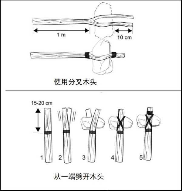 为了提高短棒的杀伤力,可以对短棒进行改进。比如一端绑上石头。第一种方法是找到一根长度、粗细合适的分叉木头,或者在一端把木头劈开,然后分叉处或劈开处绑上一块长方形的石头,绑好后就像一把斧子,可以用来进攻和防御。如图-1所示。