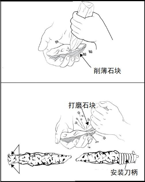 一是刀。刀能刺、砍、劈和切,也可以用来制作其他工具。野外生存,可以用石头、兽骨、竹子、玻璃或铁钉等来制作简易刀具。制作石刀需要找到质地比较坚硬的石头,比如黑曜石。把大块石头敲碎后,寻找比较锋利的碎石块,再进行削薄和打磨,得到比较锋利的石刀,还可以为石刀安装刀柄,以方便使用。如图-3所示。