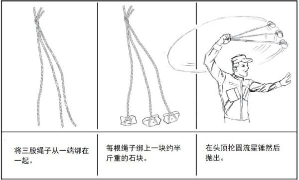 流星锤是另一种易于制造的应急工具,只需要石块和绳子。流星锤尤其适合捕捉成群奔跑的猎物或低飞的鸟类。使用流星锤时,握住绳结,并在头顶旋转,然后松开绳子,让流星锤飞向目标。当抛出流星锤后,石头会带动绳索分开,这些绳索会缠绕住猎物,使其无法动弹。如图-6所示。