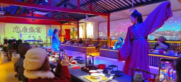 “恋唐盛宴”融合唐风雅韵与江南文脉,场内墙绘雅致、古韵浓郁。宾客入场即有鸣锣仪式,围坐古风宴席,可品尝特色美食,同时观赏沉浸式唐风歌舞表演,感受盛唐气象。