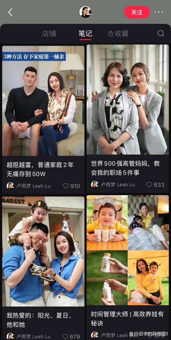 比如分享个人成长、财富管理、婚姻关系等内容的博主“卢雨梦”,她的每位家庭成员都有各自的定位。