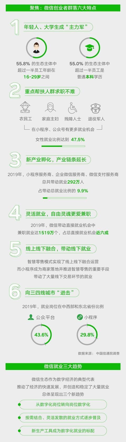 微信就业数字化程度高,呈现六大特点,包括年轻人/大学生是就业主力军、重点帮扶人群更易在微信找到新机会等;