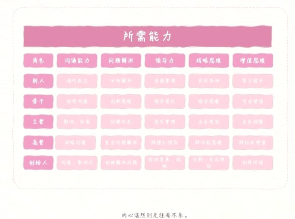 这些能力标志着个人发展的高级阶段,它们需求我们在更为广阔的视野和更高的层次上进行思考与行动。战略规划着眼于未来,是对个人或组织长远发展的精心布局,它考验我们的前瞻性和全局观念。行业洞见则是对行业趋势和市场动态的敏锐感知,它助力我们及时发现并抓住机遇,同时也能有效规避潜在风险。资源整合能力则聚焦于调动和利用各种资源以达成目标,这要求我们不仅具备广泛的人脉网络,还要善于整合各类资源。最后,领导能力体现在带领团队共同实现目标的过程中,它要求我们具备一定的影响力和号召力。