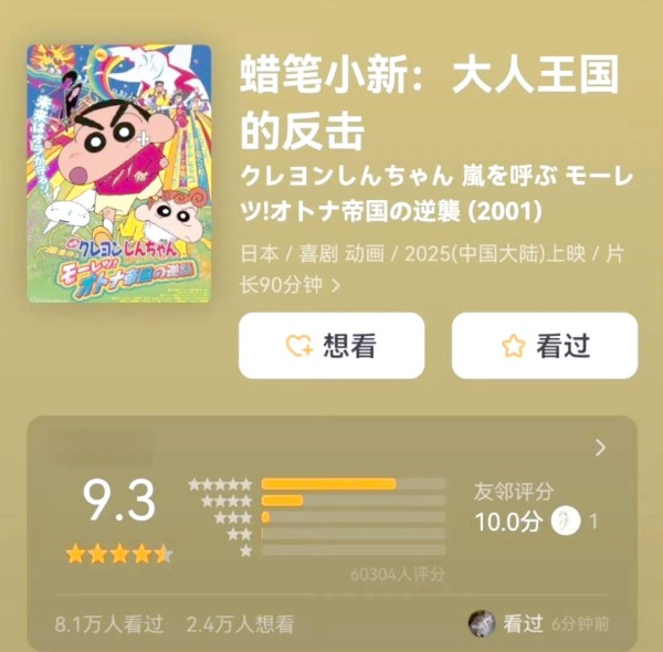 《蜡笔小新:大人王国的反击》在豆瓣上始终保持着9.3的高分,足见其深受观众喜爱。这部影片不仅延续了蜡笔小新系列的经典喜剧风格,更在笑点中融入了深情的泪点,使得亲情与友情交织,成为一场关于“过去与未来”的深情对话。影片通过动人的情节和真挚的情感,引发了观众关于“过去与未来”的思考。“春日部防卫队集体逃亡”的场景中,笑点层出不穷,而广志那段关于“人生三分钟”的描述则令人深感动容。