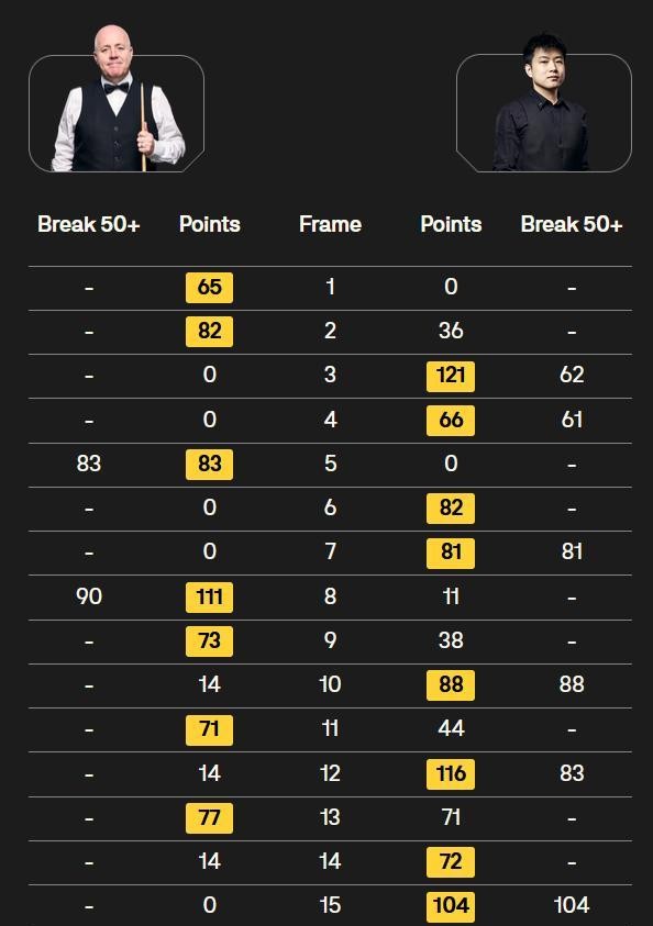 第一阶段,双方鏖战八局,节奏紧凑,互有攻守,呈现出势均力敌的态势。前八局战成4比4平,赵心童贡献三杆50+,希金斯亦有两杆50+入账,比赛异常胶着。进入第二阶段,双方依旧难分伯仲,未能确立明显优势,赵心童虽多次陷入落后,但始终紧咬比分。第15局,赵心童打出单杆破百,以8比7逆转领先,并在随后一局再度轰出破百,将比分改写为9比7,率先拿到赛点。