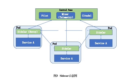 目前比较先进的3层以上可进行网络隔离的技术是微服务管理框架服务网格(Istio)下的边车(Sidecar)模式,如图3所示。Sidecar代理如边缘/服务代理(Envoy)通过流量劫持接受控制面的调度,协调与其连接的服务实例的出入站通信,实现了更细粒度调整和控制端口、协议的功能,所有网格内的Sidecar代理实例由控制平面的服务发现和流量管理组件(Pilot)管理和配置,流量控制较为容易且无需修改应用。