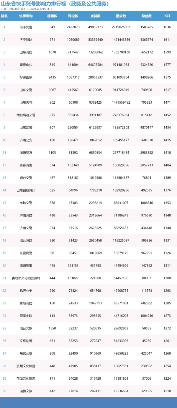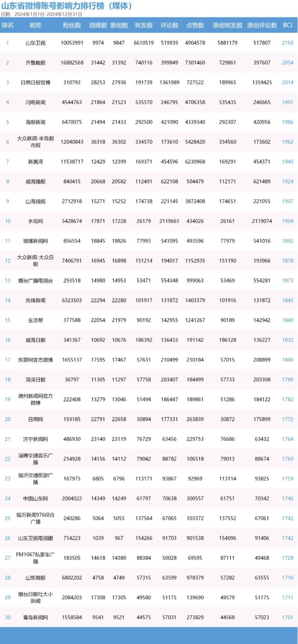 本榜单根据2024年1月1日至12月31日期间,全省政务及公共服务账号、媒体账号在微博、微信、抖音、今日头条和快手五大平台上的发文数据和传播数据,综合微博传播指数(BCI)、微信传播指数(WCI)、抖音传播指数(DCI)、头条传播指数(TGI)、快手传播指数(KCI)公式统计分析传播影响力,并以此为依据得出各平台最具传播影响力的TOP30账号。