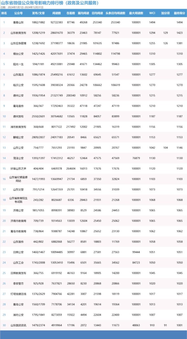 政务及公共服务账号TOP30的最终得分值均超过1000。从文章发布情况来看,年度发文量超过2000篇的账号5个,超过1000篇的账号20个。从账号活跃度来看,日均发文次数超过5次的账号4个,超过3次的账号16个。从传播效果来看,总阅读量破千万的账号16个,产生阅读量10万+热门文章的账号26个。从互动情况来看,总在看数超过十万的账号3个,总点赞数超过十万的账号6个。其中,“青春山东”传播数据突出,账号发文累计阅读量超过九千万,累计点赞数超过五十万,以1494的最终得分值位居榜首。