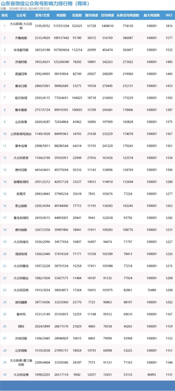 媒体账号TOP30整体传播影响力较高,账号WCI值均超过1130。从账号活跃度来看,日均发文次数超过3次的账号26个,超过5次的账号20个,日均发文量达到10篇以上的账号18个。从传播效果来看,总阅读量破亿的账号4个,产生阅读量10万+热门文章的账号28个。从互动情况来看,总在看数超过十万的账号4个,总点赞数超过十万的账号12个。其中,“大众新闻-大众日报”传播势能强劲,账号总阅读量超过五亿,总点赞数超过二百万,总在看数超过三十万,以1816的WCI值位居榜首。