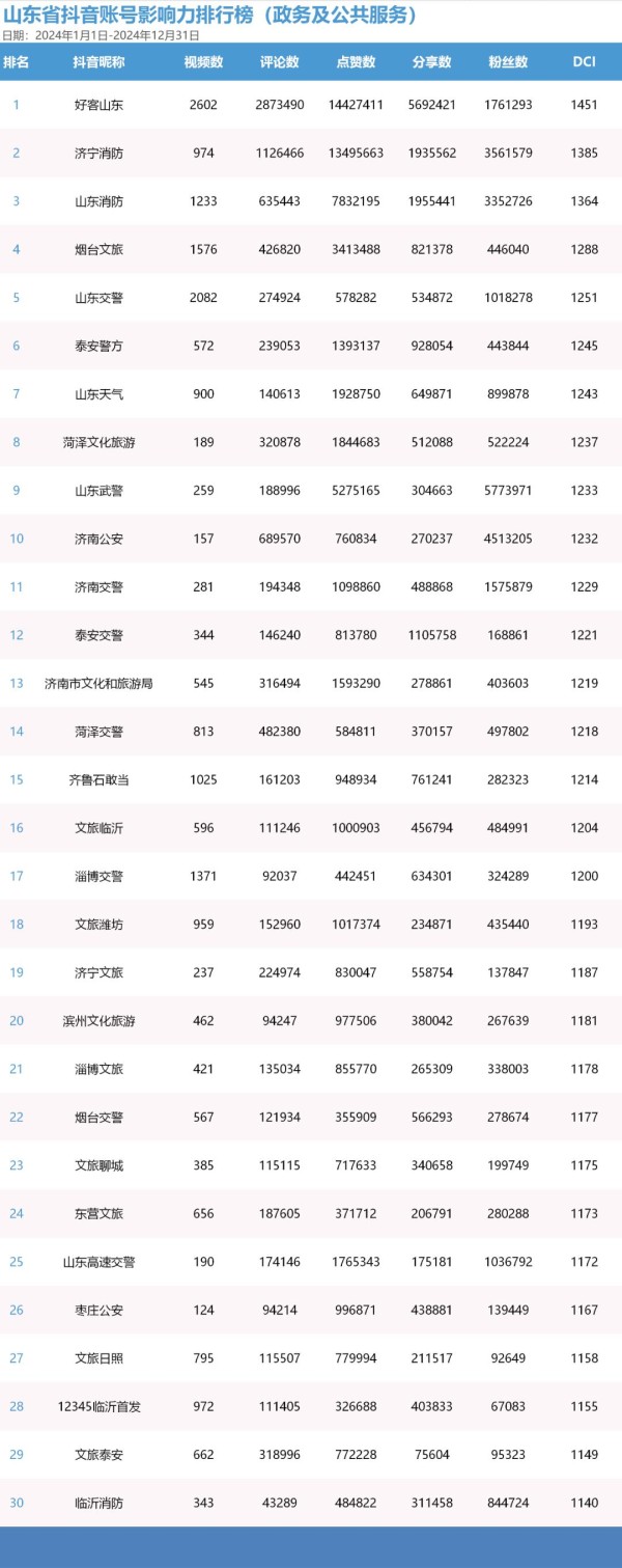 政务及公共服务账号TOP30的DCI值均超过1130。视频发布总量破千条的账号6个,超过500条的账号18个。榜单内账号互动情况良好,总评论数破百万的账号2个,总分享数破百万的账号4个;总点赞数破千万的账号2个,破百万的账号13个。“好客山东”“济宁消防”传播数据亮眼,总评论数和总分享数均超过百万,总点赞数均破千万。其中,“好客山东”获得最高分享数、最高评论数和最高点赞数,以1451的DCI值位居榜首。