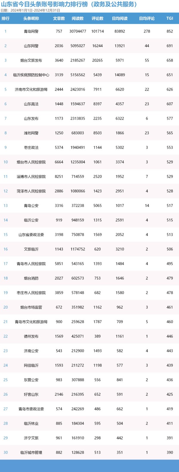 政务及公共服务账号TOP30的TGI值均高于380。从账号活跃度来看,日均发文量超过10篇的账号5个,超过5篇的账号14个,超过2篇的账号27个。从传播效果来看,总阅读量破千万的账号1个,破百万的账号11个。其中,“青岛网警”总阅读量超过三千万,总评论数超过十万,远超其他政务及公共服务账号,以852的TGI值位居榜首;“山东网警”总阅读量超过五百万,以691的TGI值位列政务及公共服务账号第二位。