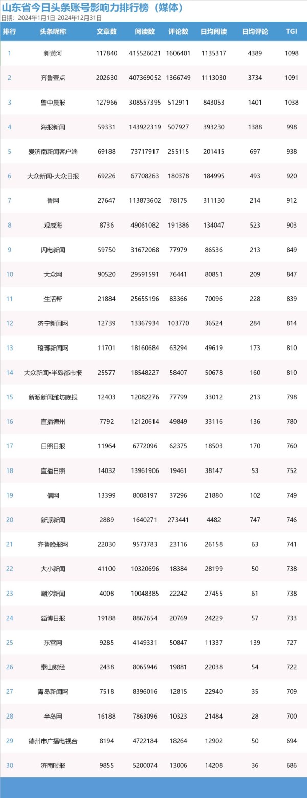 媒体账号TOP30的TGI值均高于680。从账号活跃度来看,日均发文量超过100篇的账号9个,超过50篇的账号14个,超过30篇的账号21个。从传播效果来看,总阅读量破亿的账号5个,破千万的账号19个。从互动情况来看,总评论数破百万的账号2个,超过十万的账号9个。其中,“新黄河”“齐鲁壹点”传播数据突出,总阅读量均超过四亿,总评论数均破百万,分别以1098和1091的TGI值位列媒体账号第一位、第二位。